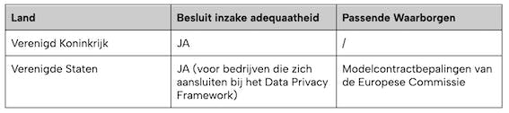Dit is niet altijd mogelijk en uw Persoonsgegevens kunnen dan toegankelijk worden gemaakt voor sommige van onze Verwerkers in de zin van de regelgeving, waarvan sommige buiten de Europese Unie gevestigd kunnen zijn, in landen die door de Europese autoriteiten worden erkend als landen die een adequaat niveau van bescherming van Persoonsgegevens bieden, maar ook in landen die niet over een dergelijke erkenning beschikken. Om een adequaat niveau van bescherming van de privacy van de Betrokkenen te waarborgen, zijn Passende Waarborgen getroffen om Doorgiften te regelen. De landen waarop deze Doorgiften betrekking hebben en de getroffen Passende Waarborgen worden samengevat in de onderstaande tabel: